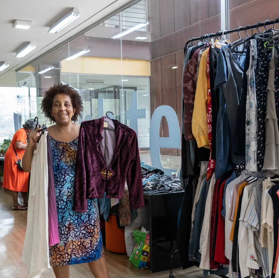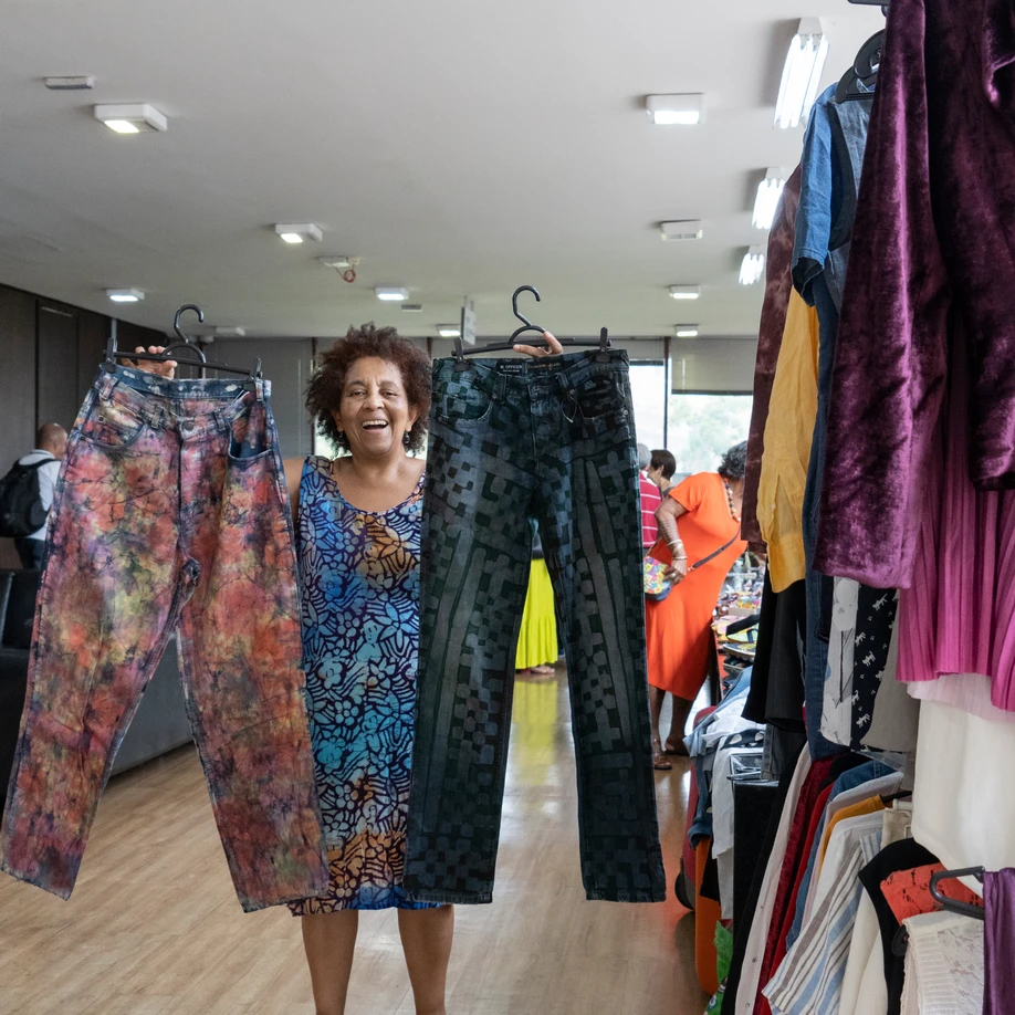 “Moda circular é o seguinte: você pegar, por exemplo, uma calça que é uma calça jeans que estava manchada e pintar aquela calça – ou transformar em um short. Uma coisa que iria para o lixo ganha uma nova vida. Isso é a moda circular!”, explica Nalva.